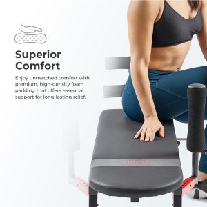 Experience comprehensive back pain relief and posture improvement with the Sunny Health & Fitness Lumbar Decompression and Stretching Table. This innovative device not only aids in effective lumbar stretching and posture correction but also provides a safer alternative to traditional inversion therapy by enabling controlled decompression. Its adjustable features accommodate users of varying heights, supporting up to 400 LB. The table is equipped with comfortable, high-density foam padding and offers user-friendly adjustability. Sunny Health & Fitness supports your journey with a detailed manual, customer service, and instructional videos, ensuring an optimal setup and use. Built to last with sturdy frame construction, this machine stands as a testament to over 20 years of quality and reliability, delivering a top-tier experience for anyone seeking to improve their well-being.