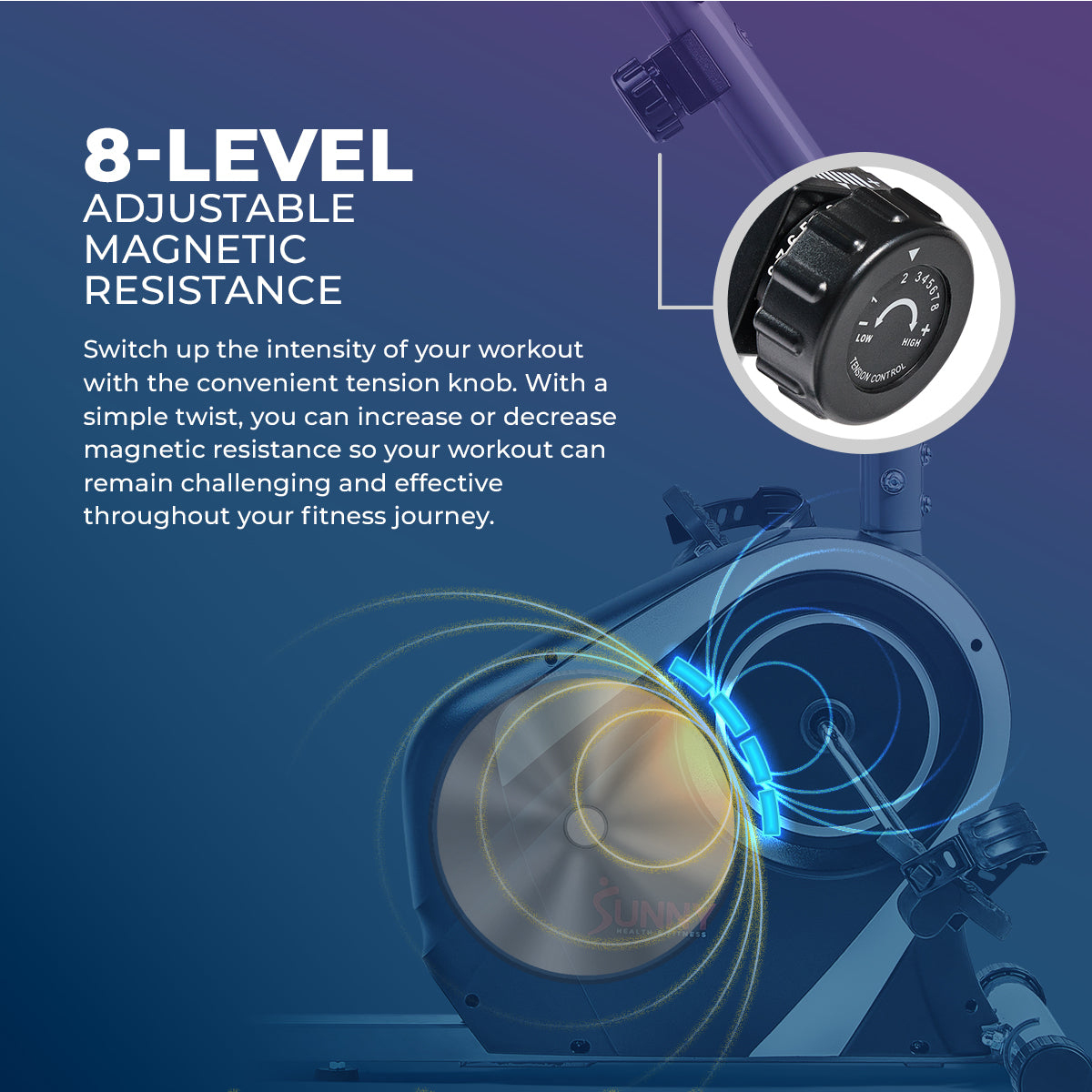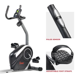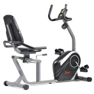 Sit back and workout with the SF-RB4616S Magnetic Recumbent Bike. This bike allows for forward and backward adjustment of the seat without having to get up. The self-leveling pedals make it easy to place your feet in the straps. Maximize your workouts with the adjustable 8-level magnetic tension control system. Track your workout progress with the LCD digital monitor that displays: Scan, Time, Speed, Distance, Calories, Odometer, and Heart Rate. Convenient handles with pulse grip sensors will allow monitoring of heart rate and workout intensity. The extended weight capacity can hold up to 300 lbs. Start today towards a healthier and happier you with the Sunny Health & Fitness SF-RB4616S Magnetic Recumbent Bike.
