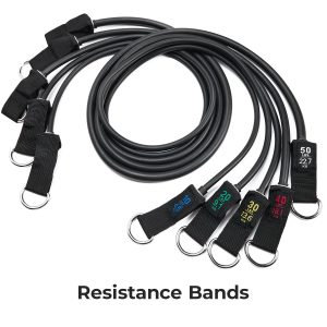 Improve your fitness and elevate your training by implementing resistance bands into your workout routine. These workout fitness bands are low impact and safe for users of all age groups and those looking to rehab as well. This set includes up to 5 bands with varying tensions reaching weights of up to 150 pounds stacked resistance. Each band reaches a different tension level: Blue 10 lbs., Green 20 lbs., Yellow 30 lbs., Red 40 lbs., and White 50 lbs. In general, elastic resistance bands engage muscles that focus on stabilization. These support muscles compliments larger muscle groups, so resistance band workouts are more comprehensive and targeted strength workouts.