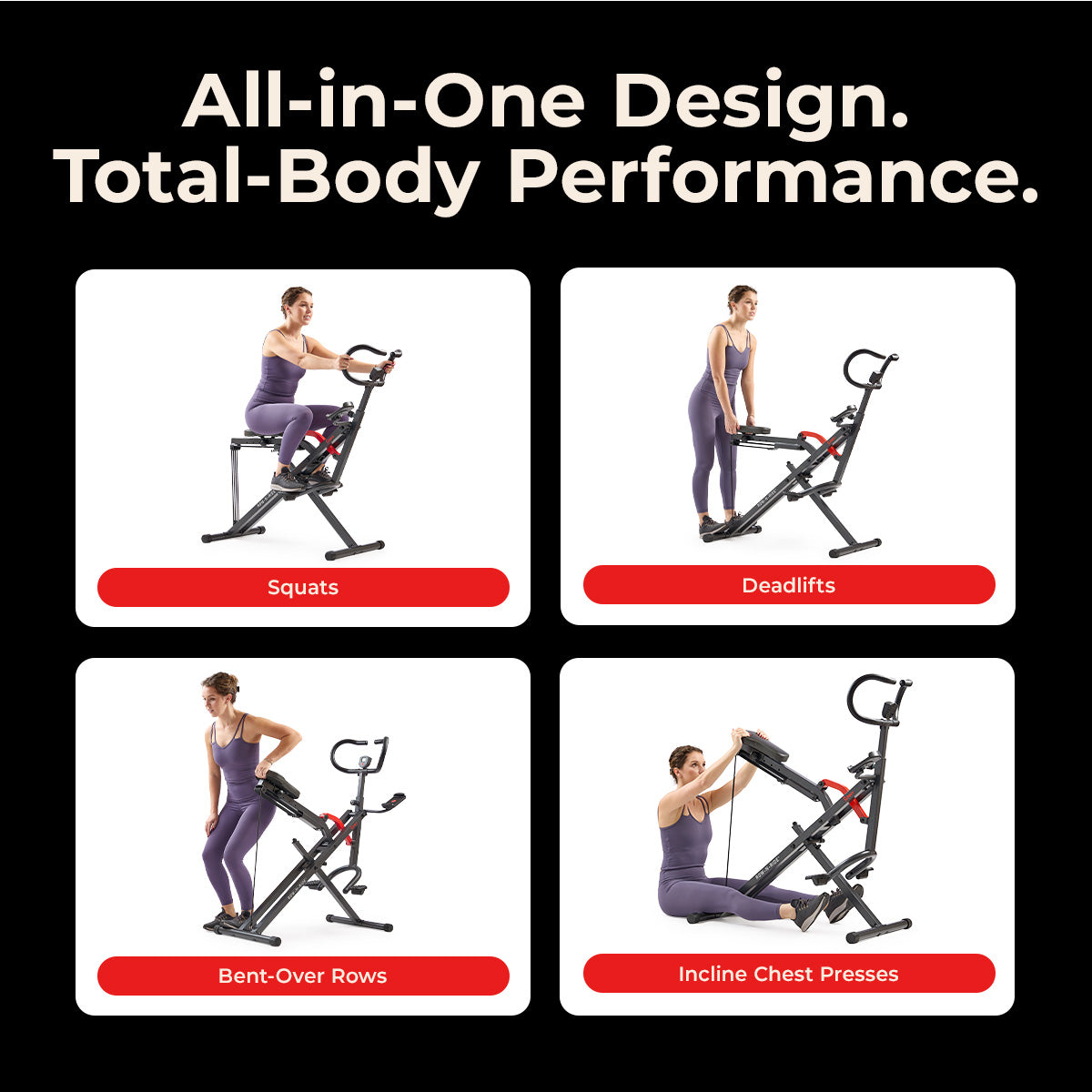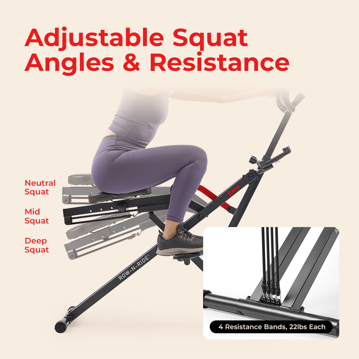 Introducing the Sunny Health & Fitness Smart Upright Row-N-Ride Exerciser (NO. 077PLUSSMART)—your heavy-duty all-in-one home fitness solution. Supporting up to 350 LBs, this compact machine combines squats, dynamic rowing, glute toning, ab sculpting, and strength training. Customize your squat workouts with adjustable settings at 30, 60, and 90 degrees for a tailored experience.