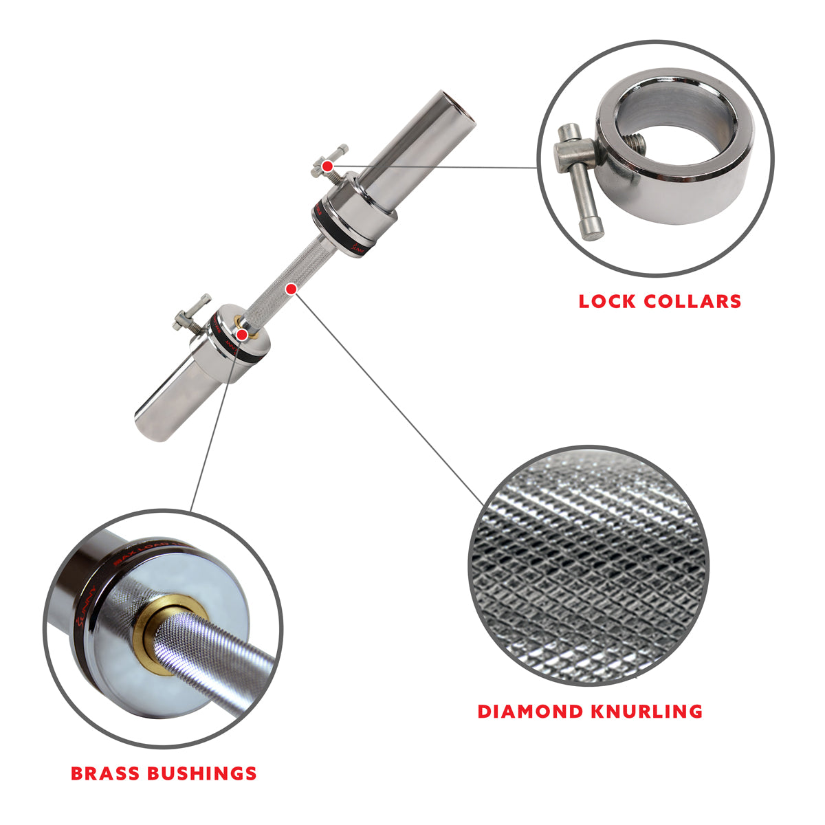 Change up your strength workout with OB-20 Olympic dumbbell with locking ring collars. This solid heavy duty bar is designed for the beginner to the advanced fitness enthusiast. It has a weight capacity of up to 150 lbs to allow for linear progressive strength gains. The rotating sleeves releases torque created by the weight and movement making it safer on the joints. The locking ring collars will secure the weights in place to make working out safer. Get two and perform dumbbell chest presses, shoulder presses, and use just one to perform triceps kickbacks and single arm bicep curls. Never miss your workout, take them with you to your office or when you go out of town.