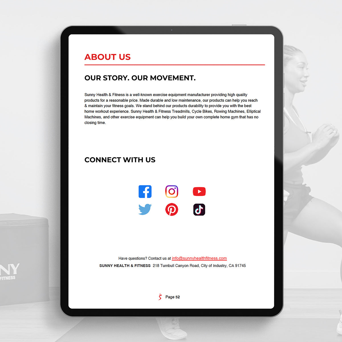 At-Home Workout Program E-book is created by Sunny Health & Fitness professional trainers Sydney and Matt. This digital book was designed to help people get fit and stay healthy when staying at home. You will get access to professional advice on how to work out at home properly, amazing workout videos with instructions, and hundreds of fitness and health-related blogs, as well as our private sunny social community, where you can ask questions to Sunny Health & Fitness’ professional trainers. This E-book is a digital file download.