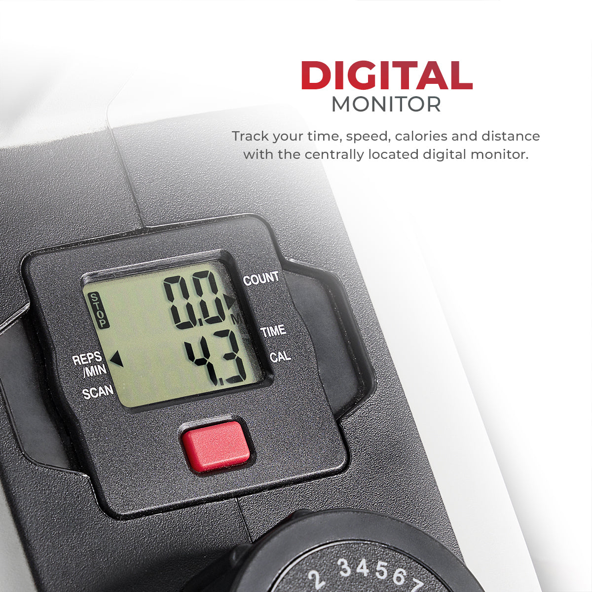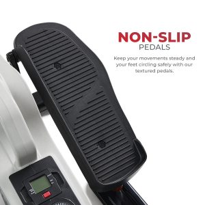 Fight against a sedentary lifestyle with the easily transportable and fully assembled SF-E3872 Magnetic Under Desk Elliptical by Sunny Health & Fitness. This space saving exercise machine can help get your legs moving in a forward motion. Large textured foot pedals prevent slippage while in use. This magnetic elliptical is excellent for increasing blood circulation, joint range of motion, and improved lower body muscular endurance. Use the tension knob to select 8 levels of belt drive magnetic resistance paired with low maintenance design to provide a wide variety of exercise intensities to fit your specific needs. Use the central digital monitor to track speed, time, calories, and distance, or choose the scan function to cycle through all workout variables. The 7-inch stride length moves smoothly with integrated wheels along the stable frame. Use the floor stabilizers for an even placement on floor surfaces.