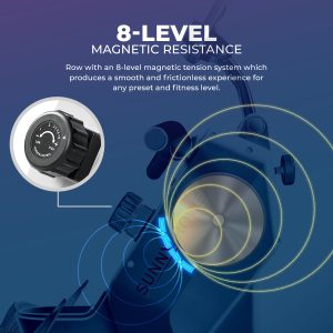 Rowing machines have never been compact and light till now with this top-of-the-line rower from Sunny Health & Fitness! Connect your rower via Bluetooth and start rowing with our certified trainers through our SunnyFit® App! Without any sacrifices to function and materials, this rower offers all of the necessities for an intense yet smooth and enjoyable workout in the comfort of your home. Built with an improved 8-level, magnetic resistance system, cushioned seat, and anti-slip foot pedals, this rower is crafted for performance and convenience. This indoor rowing machine comes with a built-in digital monitor that keeps track of your calories, distance, time, and total count to stay on track of your progress. This product will withstand the test of time while taking up minimal space when in use and stored away.