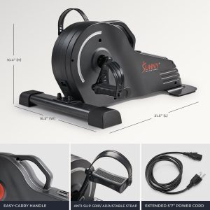 Discover the versatile benefits of our mini bike, designed for both lower and upper body workouts with low-impact exercise capabilities that minimize stress on joints. Ideal for fitness enthusiasts, rehabilitation, cardiovascular health, and muscle toning, it’s particularly suited for elderly users, offering motorized under-desk pedaling options that promote mobility and rehabilitation. Connect seamlessly via the SunnyFit App to customize and track your fitness journey, with access to over 1000 workouts and 10,000 routes worldwide. Experience quiet and adjustable training with 18 speed levels and fingertip control through a remote, monitoring speed, time, and pre-set programs effortlessly. Equipped with auto-stop safety features and compact at 21.5 x 16.5 x 10.4 inches and 15.9 pounds, it includes an easy-carry handle, adjustable foot straps, and anti-slip pedals for convenient placement and hassle-free assembly, backed by over 20 years of excellence from Sunny Health & Fitness, ensuring a secure and enjoyable workout experience for every user.