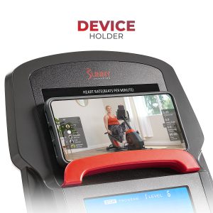 Cycle into fitness with the SF-RB4850SMART Programmable Recumbent Bike by Sunny Health & Fitness. Slide your feet onto the universal pedals that have textured grips and universal straps for optimal stability. Sit comfortably on the wide recumbent bike seat, equipped with breathable mesh back support. Use the easy-to-use seat adjustment lever to modify your distance from the pedals (leg inseam 29.9 inches to 39.4 inches). Take advantage of the step-through design to easily mount and dismount the cardio machine. Made for enduring workouts, the cardio stationary bike has a 300 lb user weight capacity. Grab the seat-level pulse grips to check your heart rate while exercising. This recumbent bike has 16 levels of automatic magnetic tension, which can be controlled through the console. Enjoy a smooth and quiet exercise experience, powered by a virtually maintenance-free belt-drive mechanism. Perform 13-inch strides that are easy on the joints when you rotate the 6.6-pound flywheel pedal while providing you with an alternative cardiovascular workout. Use the color meter display to track your time, speed, rotation per minute, distance, calories burned, pulse, and wattage. Take advantage of 24 built-in programs that are designed for various fitness levels, built-in BMI calculator software, and additional target heart rate and wattage programs. Place your phone or tablet onto the device holder. Use the water bottle holder to keep your favorite drink in arm’s reach. Maintain stability when you exercise by adjusting the ground levelers. Designed for easy moving, use the lift handle on the rear of the recumbent stationary bike to move the bike from room to room by using the onboard transportation wheels.