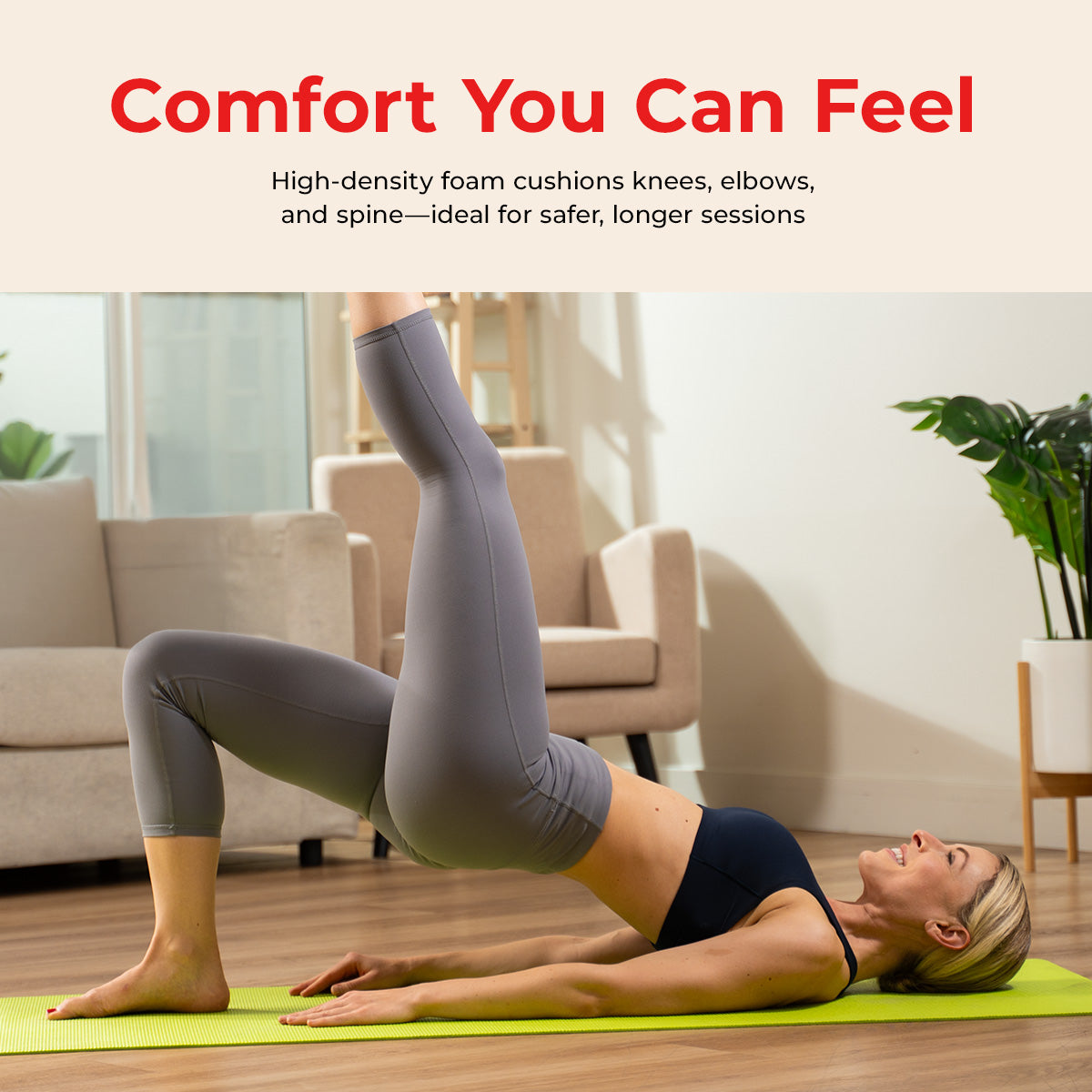 Crafted from professional-grade, tear-resistant PVC, it’s built to withstand daily use without stretching or peeling. The textured surface supports steady positioning across hardwood, tile, or carpet, while the lightweight, closed-cell construction resists moisture and wipes clean easily. Whether you’re practicing Vinyasa, Pilates, or meditation, this mat delivers the ideal balance of joint protection and floor connection—at home, in the studio, or on the go.