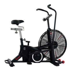 Train like a champion with unlimited resistance on the SF-B2729 LX TORNADO Air Bike by Sunny Strength®. The newest Tornado Air Bike is bigger, sturdier and more durable, built for the toughest workouts. Dimensions: 55L x 23.5W x 49H inches. The greater your speed and force the more resistance this fan bike can make! The commercial grade oversized 27.5-inch fan wheel drives unlimited air resistance as you pedal forward with heavy momentum. The stylish red paddles are enclosed in an upgraded fan cover guard to protect from accidental dirt and debris from damaging the fan. Ergonomic extreme grip handlebars are designed to increase muscle engagement in the arms, back, and shoulders during the push and pull action. This upright bike is packed full of incredible features. The large multi-function screen displays your fitness metrics simultaneously as your pedaling hard on the fan bike.