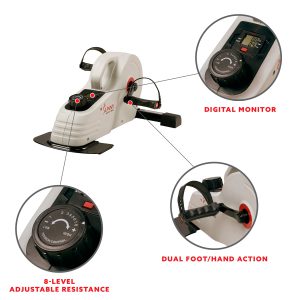 Make room for physical activity when you are sitting with the Sunny Health & Fitness SF-B0891 Under Desk Magnetic Cycle. Slide your feet onto the pedals with adjustable strap. Achieve a 7-inch stride length smoothly, quietly, and consistently on this under desk machine while you are seated. We crafted this machine around silence. Engage the smooth belt-drive mechanism and the 3.52 lb flywheel as you pedal forward. The pedals have a peak height of 10 inches and bottom height of 3 inches, when on the ground. Use this machine as a low-impact exercise alternative that can help engage your lower body with little joint stress. The pedals can also be used as hand grips. You can use this machine on a desk-level surface and pedal your arms to promote upper body activity. Exercise without being tied to a plug. Stay in control of your seated workout cadence with the manually-powered design. Track your speed, time, distance, and calories burned in real time with the battery-powered exercise display. Cycle through 8 levels of magnetic tension that is controlled by a responsive dial. Weighing just over 19 lb, this machine can be moved easily with the sturdy hand grip. Easily store your under-desk machine (20.5L x 16.5W x 10.5H in) in a bedroom, office, or the trunk of your car. Make your next low-impact exercise a quiet and consistent one with the Sunny Health & Fitness Under Desk Magnetic Cycle.